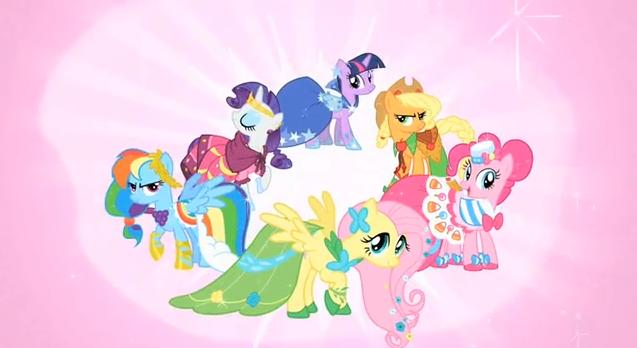 Interestingly enough, as they arrive in Canterlot we see many other carriages also being pulled by males. The 'mane 6' disembark, and we see their Gala gowns.